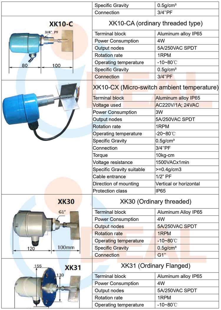 Rotary paddle level switch is used for solid materials(including powder, massive, granular, gel, etc.) It has outstanding features such as good sealing, strong overload capacity, lightweight and easy to install, large output contacts capacity, etc. In view of the different Specific Gravity of material can be done by adjustable tension of the spring, contact material part of its full stainless steel material. Rotary paddle level switch in the chemical, plastic, cement, medicine, feed, food and other industries widely used.